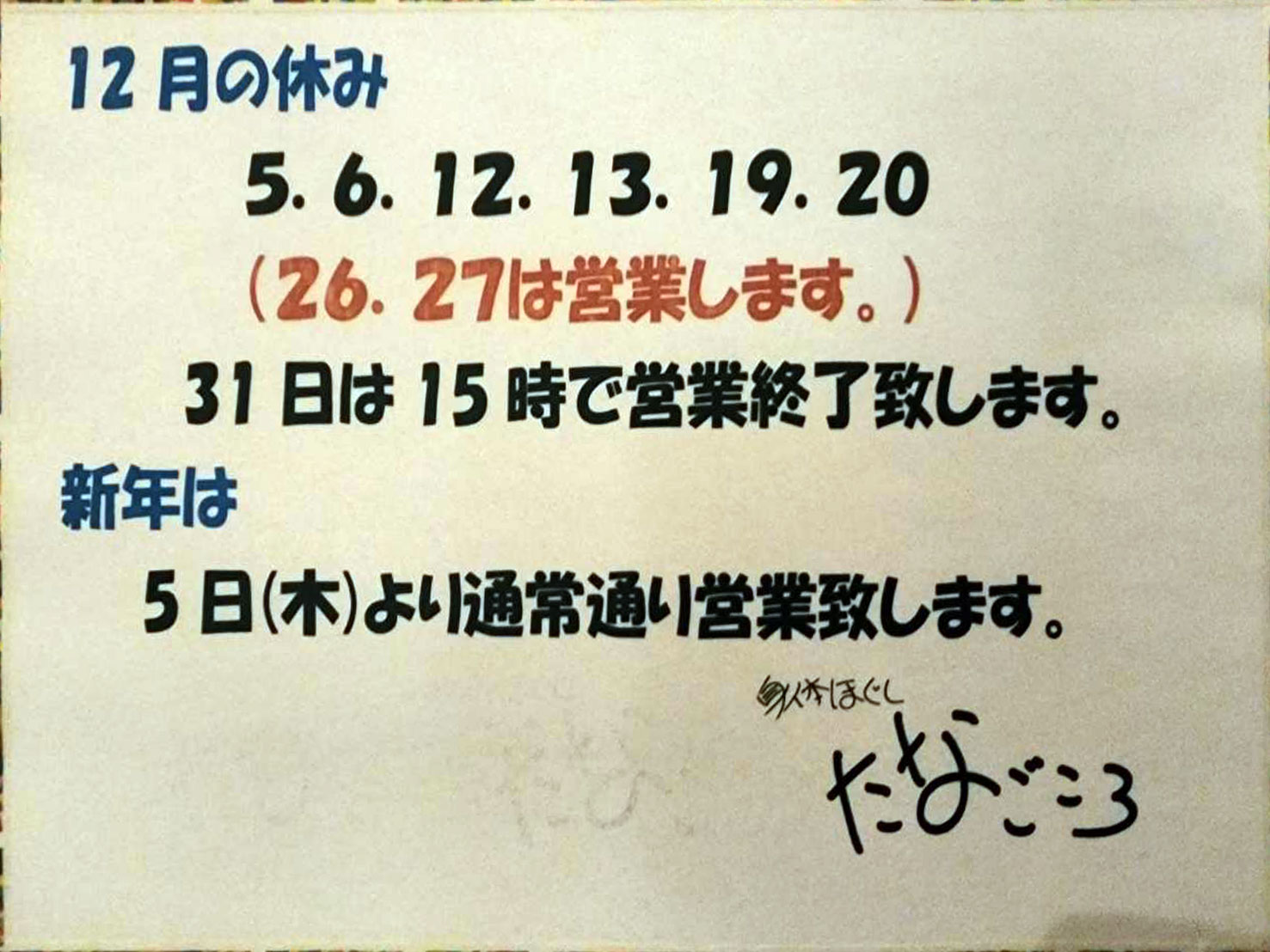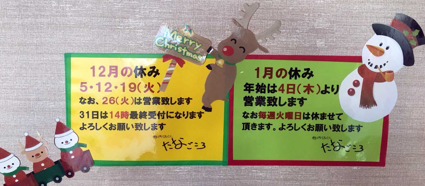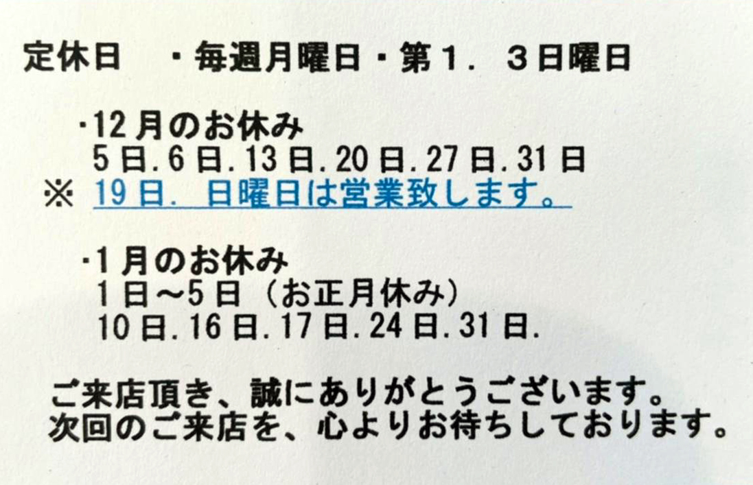 さて、12月と1月の定休日のお知らせをトップページに更新いたしました。