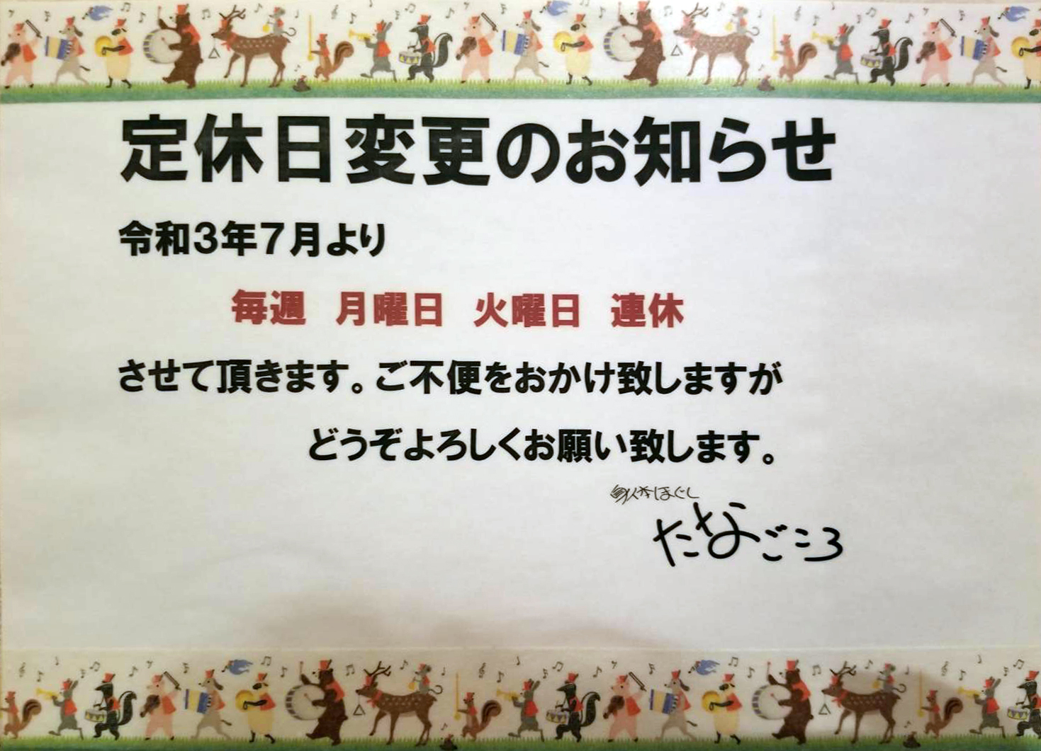2021年7月より定休日を変更させていただきます