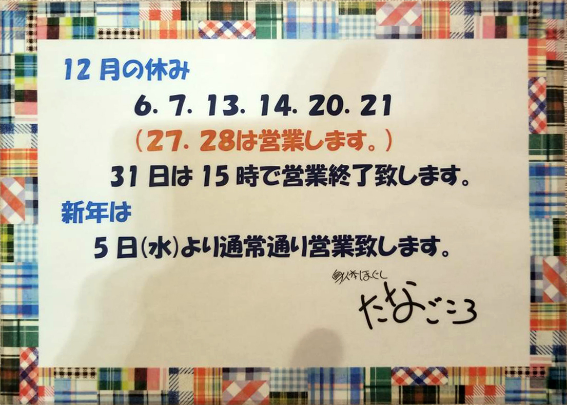 12月の定休日情報を更新いたしました。