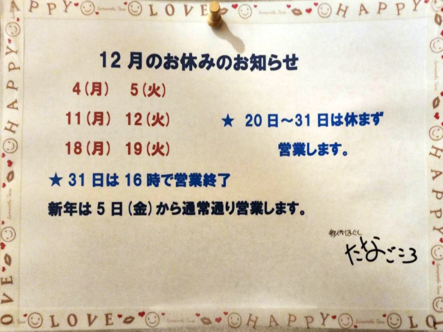 今年も1年、たなごころをご贔屓にしていただきましてありがとうございました。来年もどうぞよろしくお願いいたします。