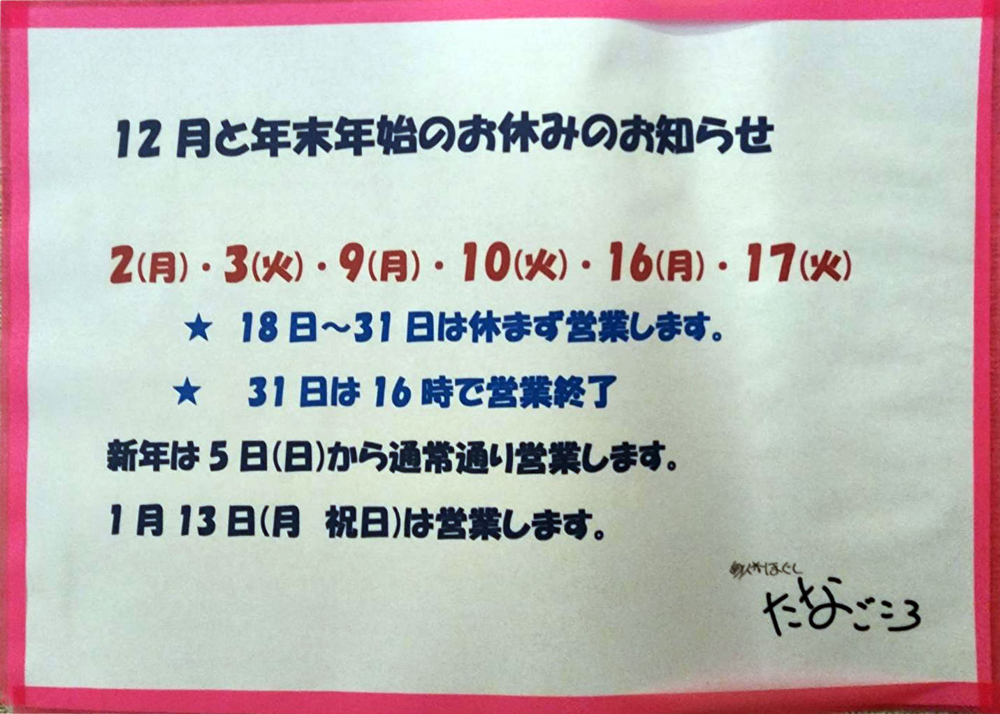 尚、年末年始の営業は以下の通りです。