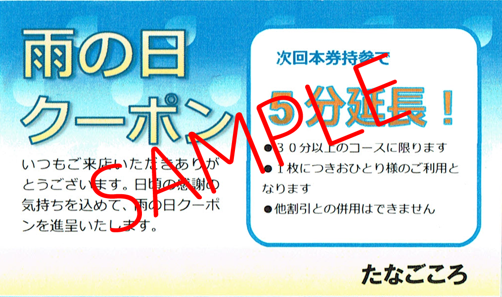 ジメジメ、ジトジト、梅雨の時期の雨降りは気持ちもどんよりしますね。当店ではそんな雨の日にわざわざお越しいただいたお客様に、雨の日クーポンをご用意してお待ちしております。