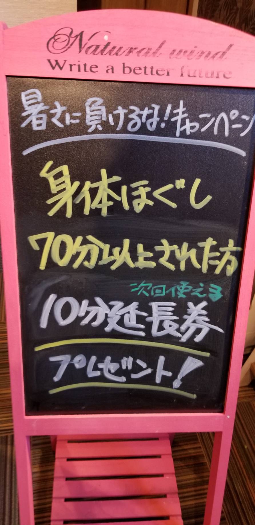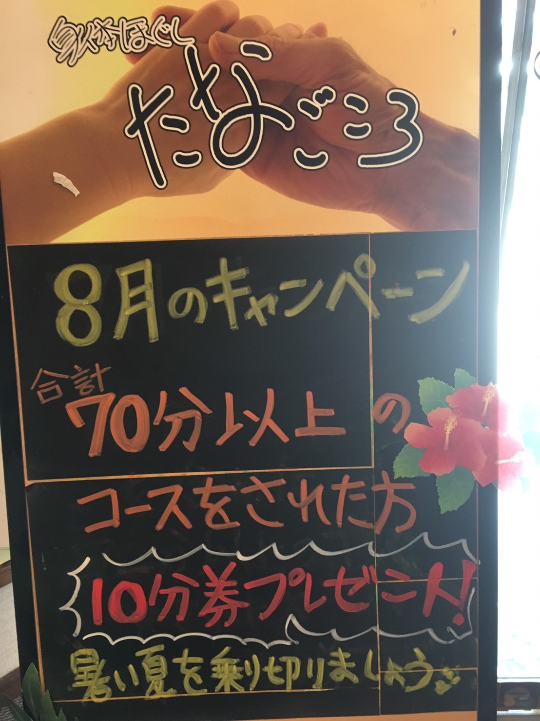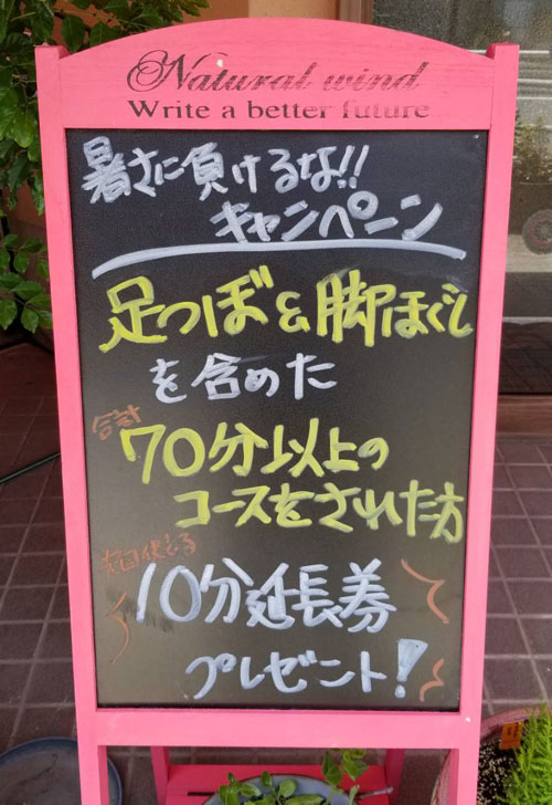 7月に実施しておりました「10分延長券」プレゼントキャンペーンですが、好評につき8月も引き続き実施させていただくことにいたしました。 いよいよ夏本番という感じになって参りましたが、当店での癒やしのひとときを是非お過ごし下さい。