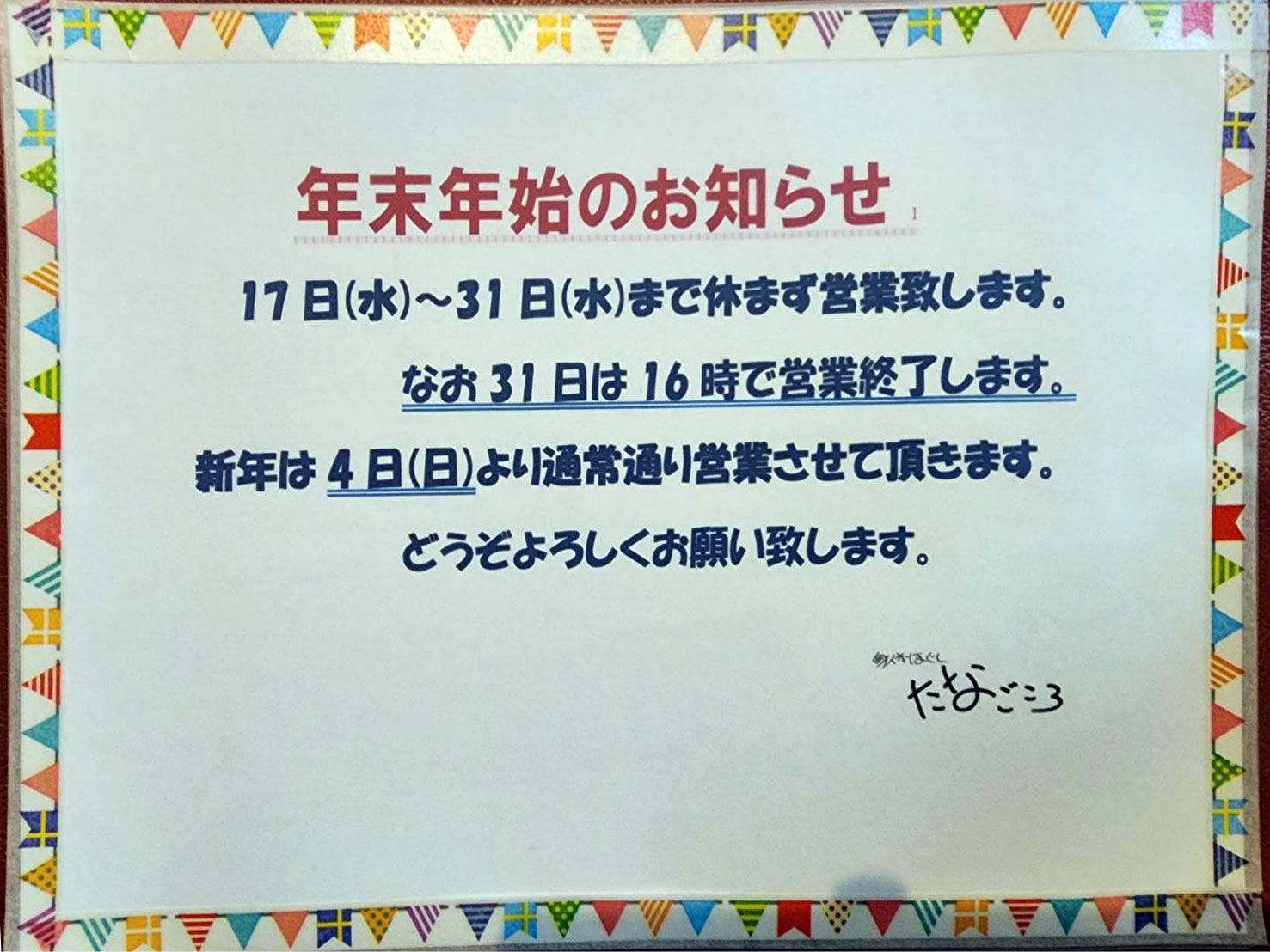 今年も1年、たなごころをご贔屓にしていただきましてありがとうございました。来年もどうぞよろしくお願いいたします。